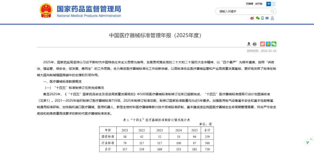 2025年,医疗器械标准建设成效凸显,“十四五”500项标准制修订任务超额完成,现行有效标准达2082项,且完成从“量的积累”向“质的飞跃”的转型。