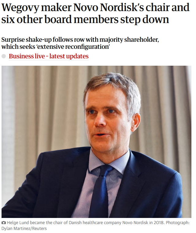 近日,诺和诺德(NVO)宣布,董事长Helge Lund(龙海歌)携六名董事(包括五名独董)将于11月14日特别股东大会后集体离职。原因在于诺和诺德董事会与控股股东诺和诺德基金会就董事会未来组成等事项未能达成一致。